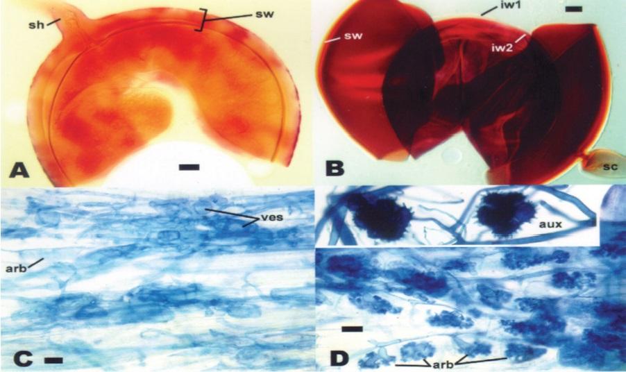 Gambar 2. Spora dan kolonisasi akar (Bever et al., 2001). a) struktur subselular dari spora Glomus clarum yang pecah menggunakan reagent Melzers, b) struktur subselular dari spora Scutellospora pellucida yang pecah menggunakan reagent Melzers, c) mikoriza Acaulospora morrowiae dengan pewarnaan 05% trypan blue, d) mikoriza Gigaspora rosea dengan pewarnaan 0.05% trypan blue. Ket : sw = spore wall, sh = subtending hyphae, sc = sporogenous cell, iw1 = first inner wall, iw2 = second flexible inner wall, arb = arbuscule, ves = vesicle, aux = auxillary cells. Scale bar = 20 μm.